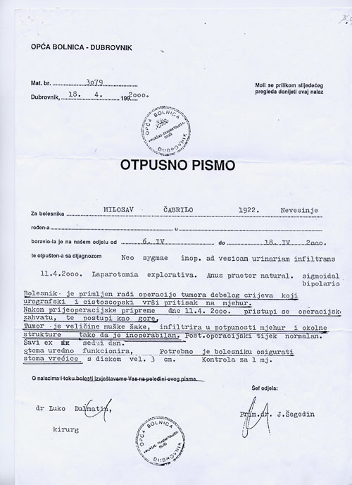 neuspjele operacije inoperabilnog tumora debelog crijeva, veličine
